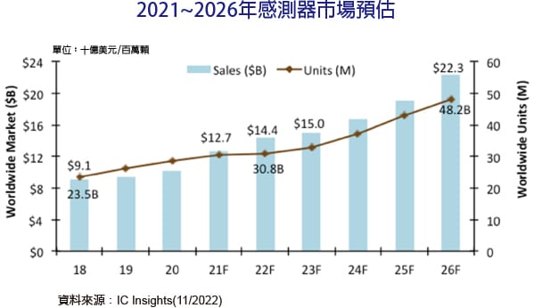 以出貨量來看,2022年感測器的整體出貨量將僅比2021年成長1%,但仍將再度刷新2021年所創下的紀錄,達到308億顆。至於在銷售金額方面,受到平均銷售價格(ASP)提高的挹注,2022年感測器市場規模將達到144億美元,比2021年成長13%。